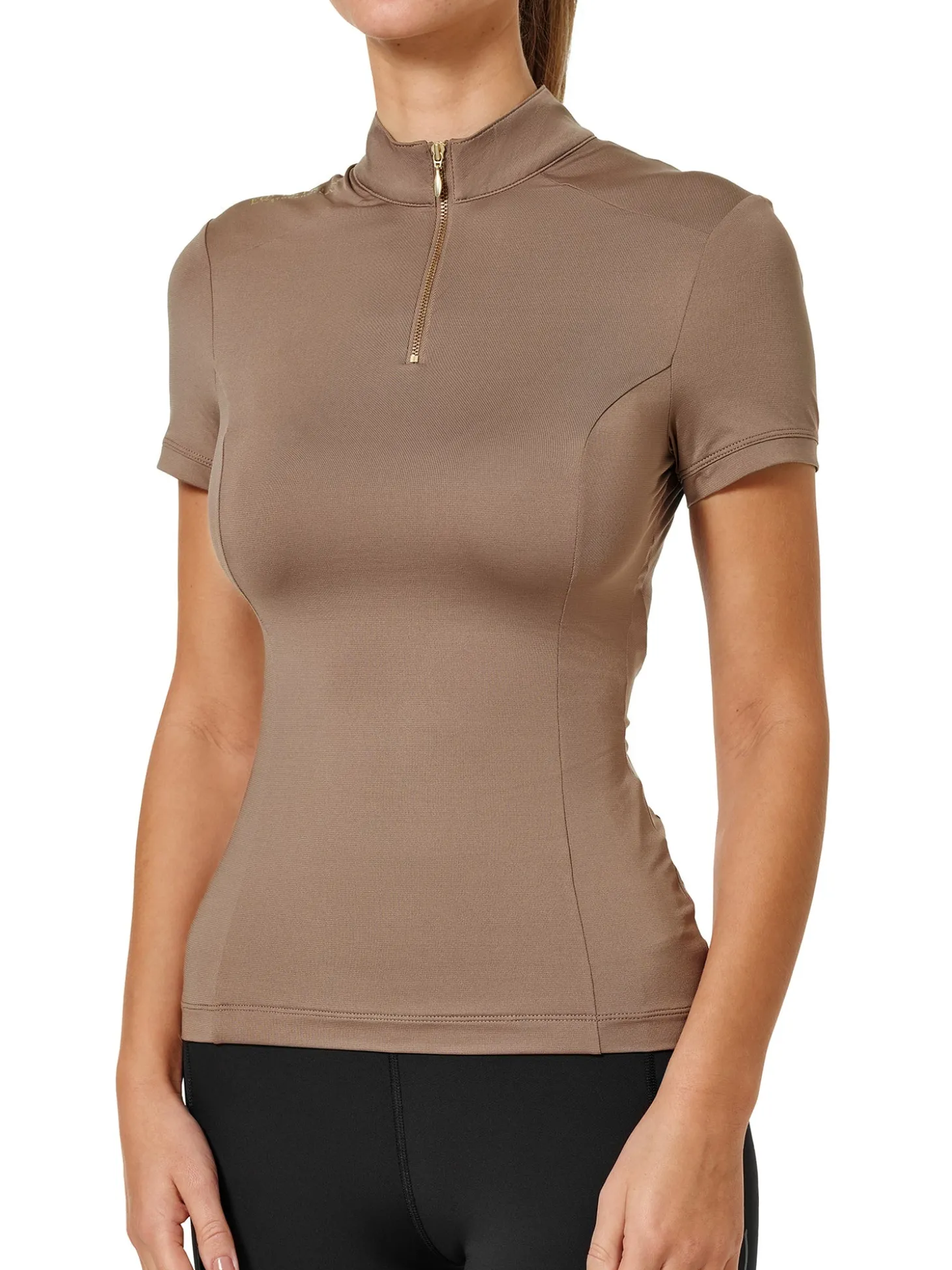 Dieses ultimative Reittop ist in einem eleganten beige/braunen Design mit einem goldenen Reißverschluss auf der Vorderseite entworfen. Es besteht aus einem atmungsaktiven Mesh-Einsatz und ultradünnem Material, das atmungsaktiv ist und einen kühlenden Effekt hat.